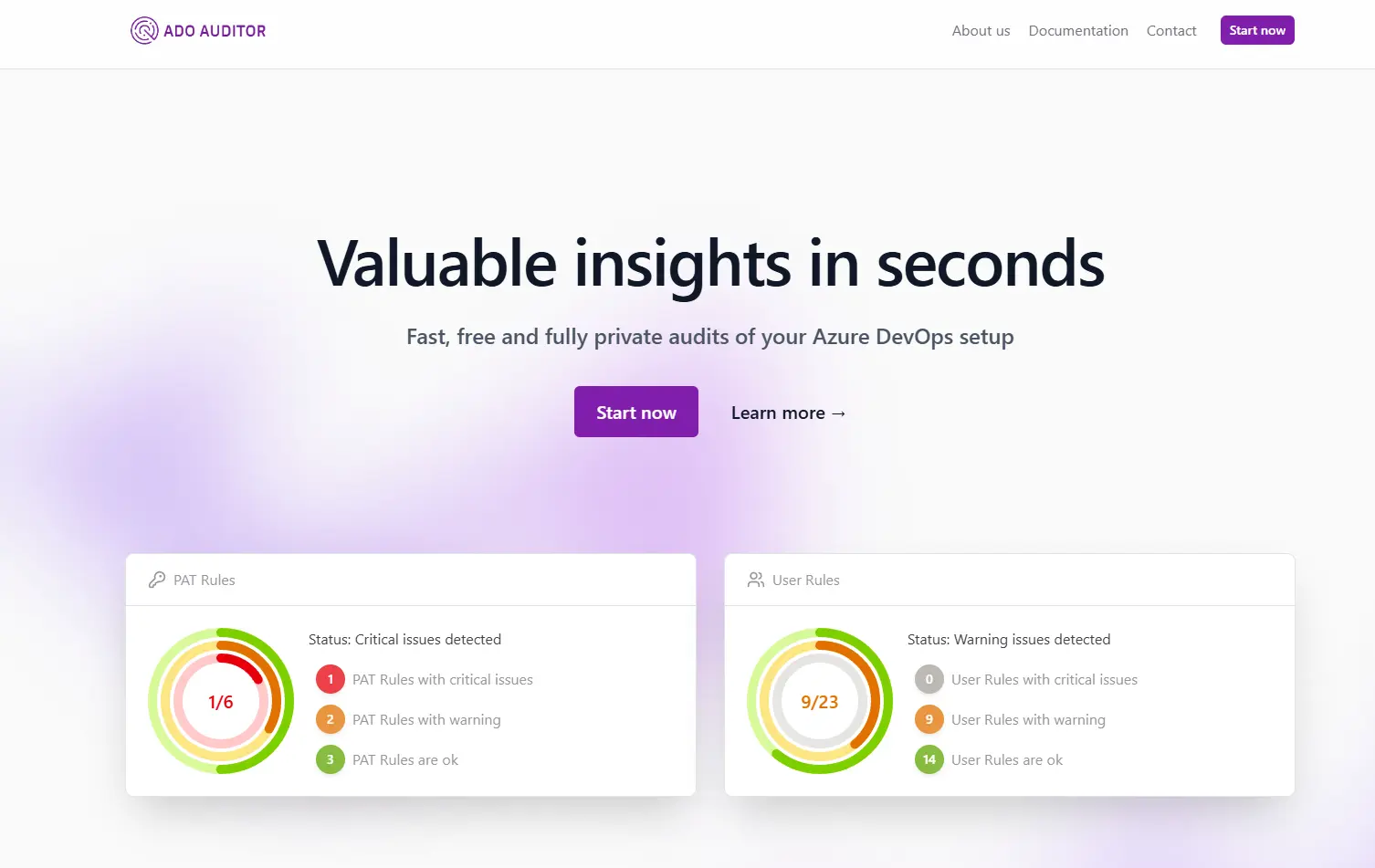 It provides an instant overview of the status of your Azure DevOps environment (e.g. critical issues with PAT rules) without having to manually execute complex scripts.